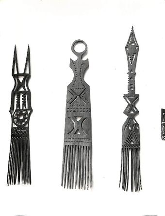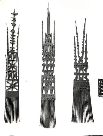 Photo of three combs with elaborately carved handles (V26)Te Puna Vai Marama Cook Islands Centre for ResearchImage Cook Islands Online -