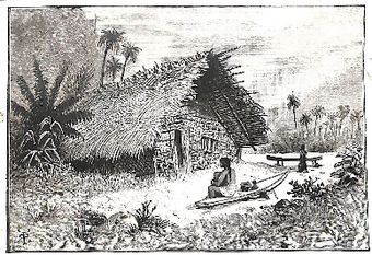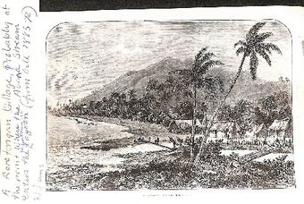 Photo of 'A Rarotongan village, probably at the point where the Avana Stream enters the Ngatangiia lagoon(from Gill 1885:72)Te Puna Vai Marama Cook Islands Centre for ResearchImage Cook Islands Online -