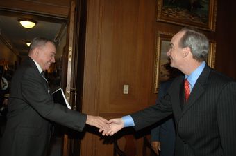 [Assignment: 48-DPA-02-26-08_SOI_K_Bice_Penn] Secretary Dirk Kempthorne [meeting at Main Interior with Department of Defense delegation including the Assistant Secretary of the Navy for Installations and Environment], S.J. Penn, and [the Executive Director of the Joint Guam Program Office, retired] Major General David Bice [48-DPA-02-26-08_SOI_K_Bice_Penn_IOD_1224.JPG]National Archives at College Park - Still PicturesImage