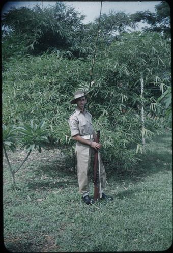 Kit Denton, in uniform, is holding a gun : Port Moresby, Papua New Guinea, 1953 / Terence and Margaret SpencerNational Library of AustraliaImage Papua New Guinea 1953 to 1978